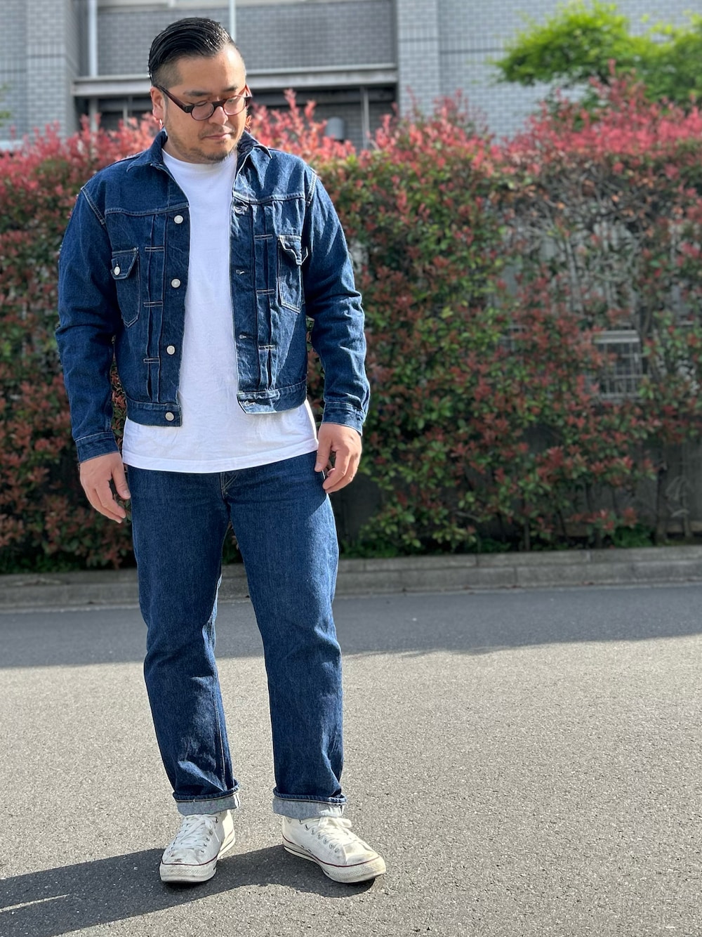 オアスロウのジージャン、ジーパン、 ヘインズのビィーフィーTシャツ、 コンバースのオールスター。