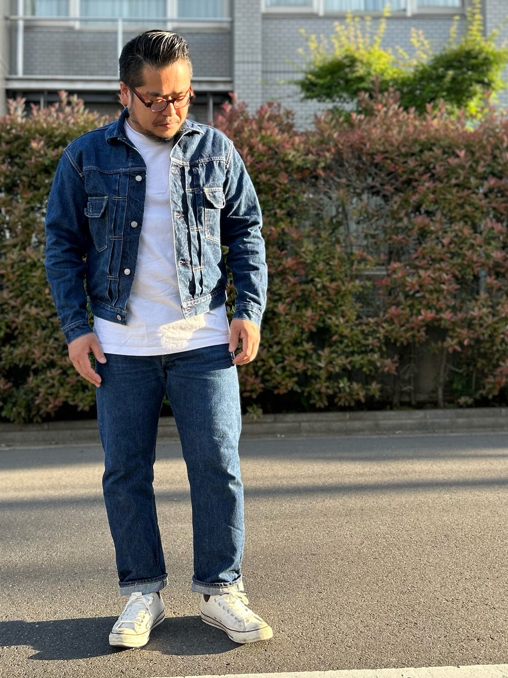オアスロウのジージャン、ジーパン、 ボディーワイルドのポケットTシャツ、 コンバースのオールスター。 ヘインズより少し小さめのサイズ感で丈も短いので、パンツインしない場合はこっちの方が良いかもしれません🫡