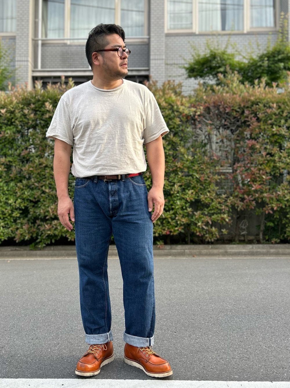 ドゥニームのTシャツ、ジーパン、ベルト、 レッドウィング875。