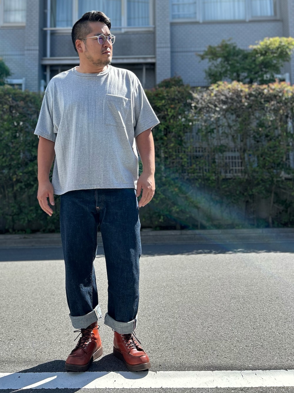 インテリムのTシャツ、ジーパン、 ディフィデュケーションのブーツ。 ヘビーオンスTシャツが主流なところちょうど良い感じの生地感のTシャツだったので色違いでグレーも買いました🙆🏻♂️