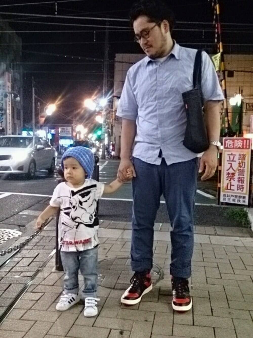 買い物帰りにすっかり暗くなってしまいましたが、踏み切りを見てご機嫌になってくれた息子と。 ドゥニームのニット帽を気に入ったようで、自ら被ってくれました! 今回はお揃いの要素が無いですね…。 あ、インナーはスターウォーズのTシャツです。 息子のスタイリングは親バカですが、秀逸ですね。 白いTシャツに色の薄いデニム、そしてニット帽に白のスニーカー。 私も今度、真似します(笑) ドゥニームのストライプトラウザーは薄手で夏でも涼しくはけます。形がお気に入りです。 PONYのcitywingsのジョーダンカラー(?)は妻から誕生日で買ってもらいました!! 1年間、このスニーカーの画像を毎日のように見せ続けたら、買ってもらえました(笑) 次は何の画像を見せ続けようか思案中です。