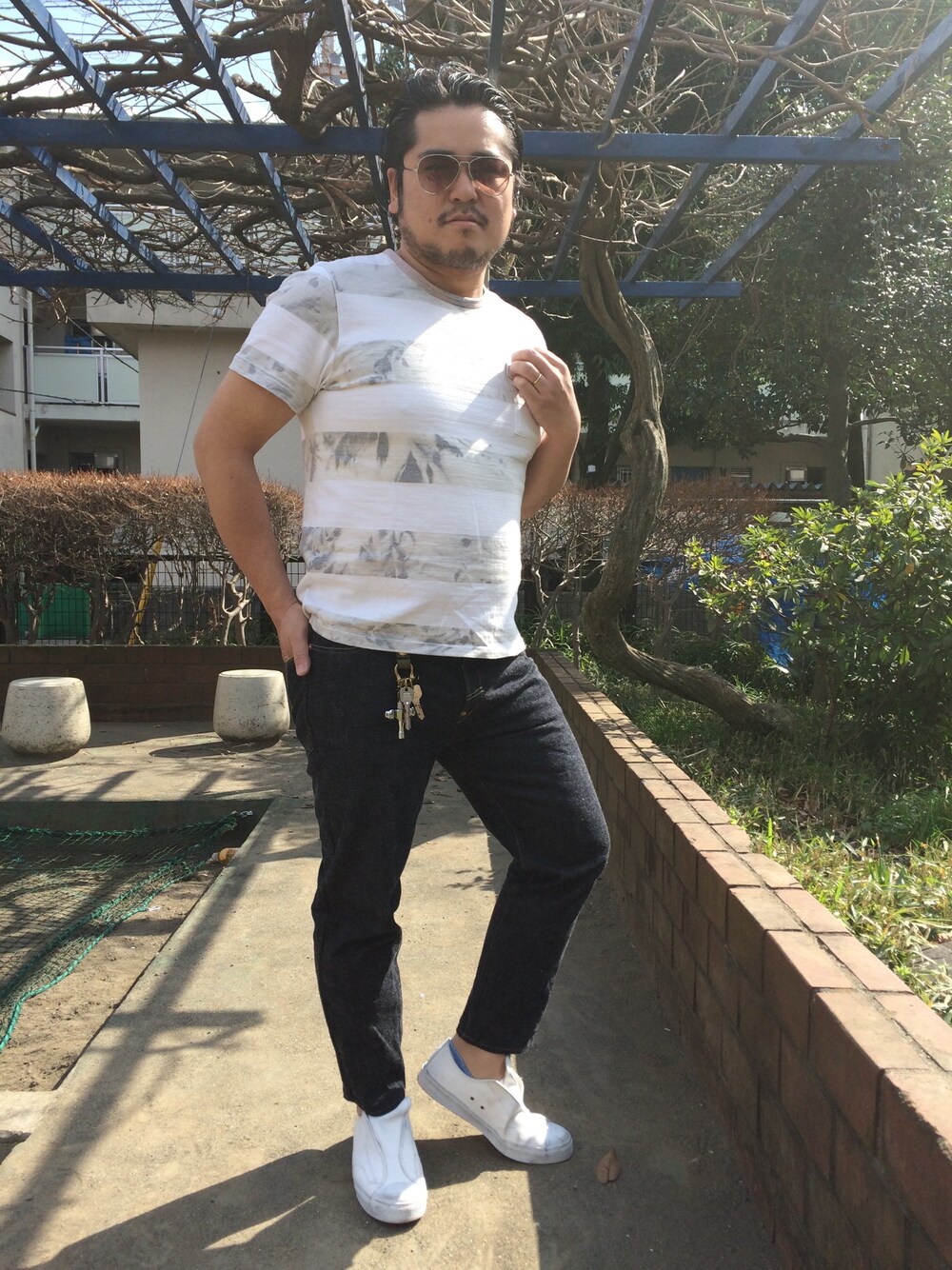暖かくなってきましたので、春らしいコーディネートを。 新作のdenime×DELUXEのデニムパンツを妻に怒られながらも購入!! なかなか独特のシルエット、ディテールでいい感じです。 zozoの商品写真を参考にさせていただきましたが、こちらも怒られるんじゃないかと思っております。 ふざけてすみませんでした。 Tシャツは本当はグレーのボーダーなのですが、間違えてワイドハイターでなく普通のハイターに漬け込んでしまい、ケミカルウォッシュになってしまいました。 しかし、いい感じかなと思ってます。 ふざけてしまって申し訳ございません。