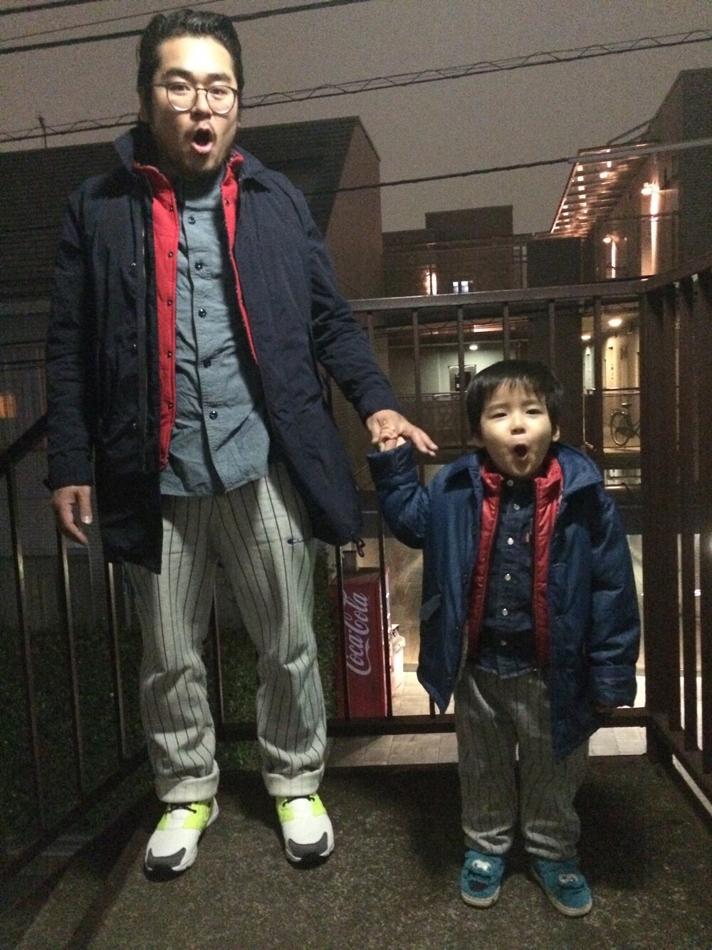 お揃いシリーズ。 ネイビーのジャケット、 レッドのダウンベスト、 デニムシャツ、 ストライプのスウェットパンツ、 スニーカーはそれぞれ(お揃いじゃねぇじゃねぇか・・・) バリエーションも増えてきて、暖かくなるのが楽しみです。