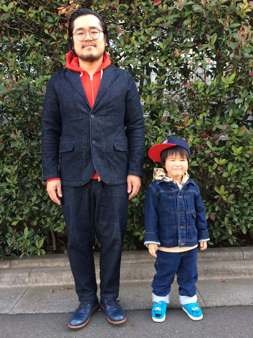 お揃いではないですが、デニムオンデニムにパーカーという部分でお揃いということで。