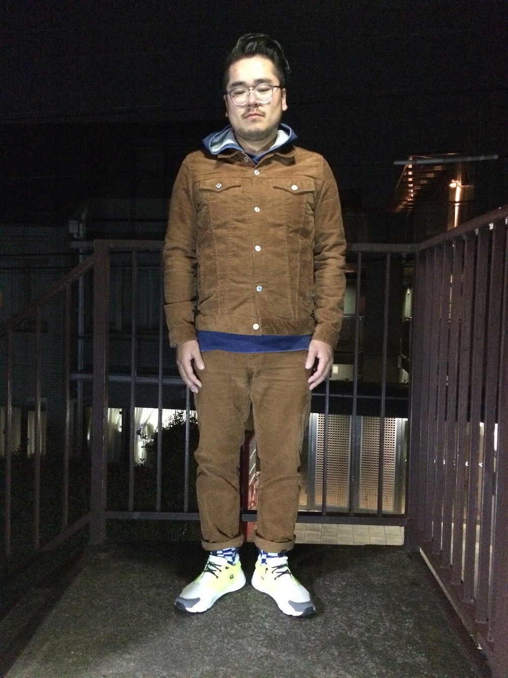 セットアップシリーズ。 ドゥニームのコーデュロイのセットアップ。 インナーにはインディゴのスウェットパーカー。 靴はフューリーライト。 おっさんになってきたので気温の変化について行けませんね。