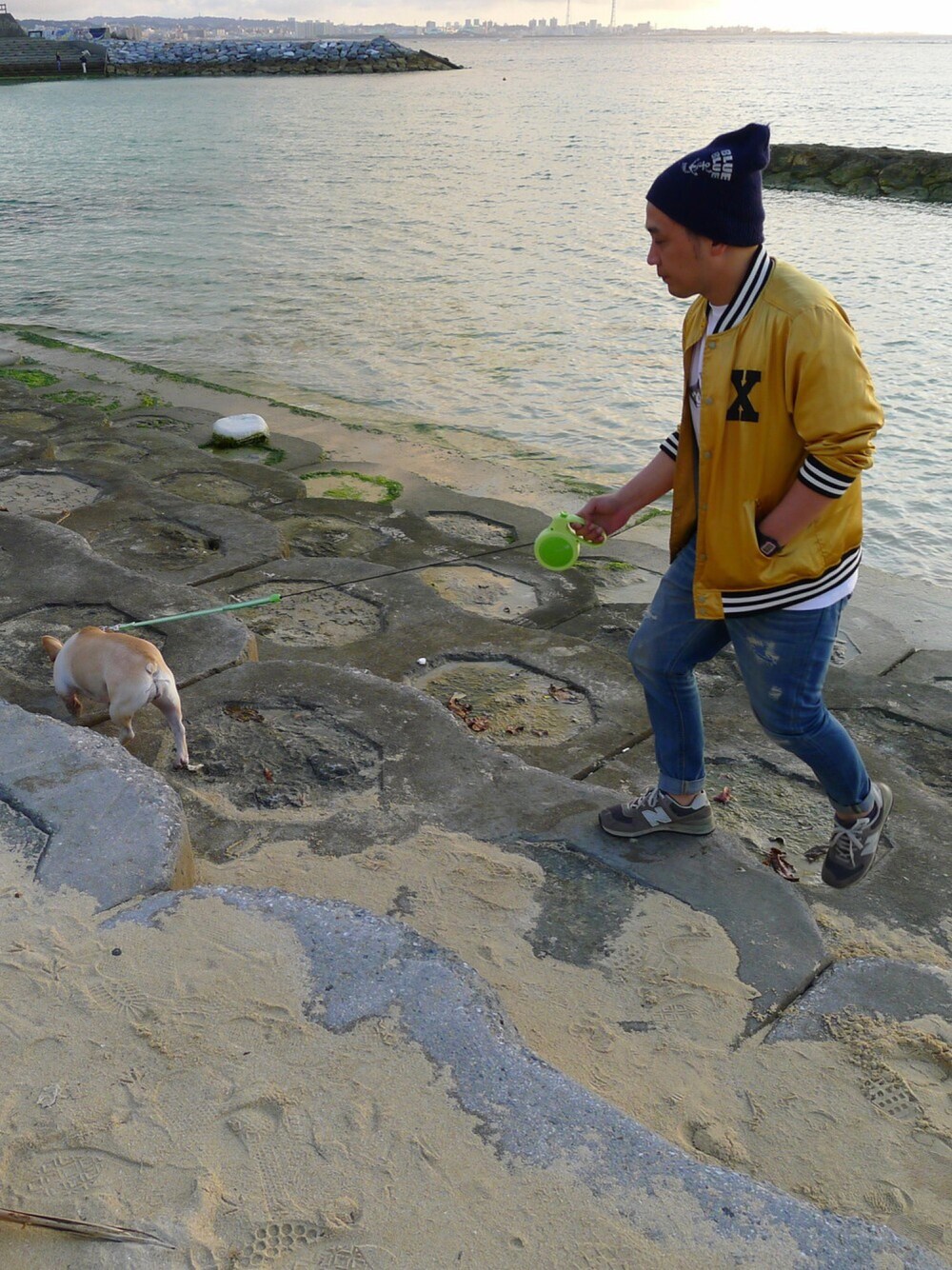 沖縄の海辺で散歩中。