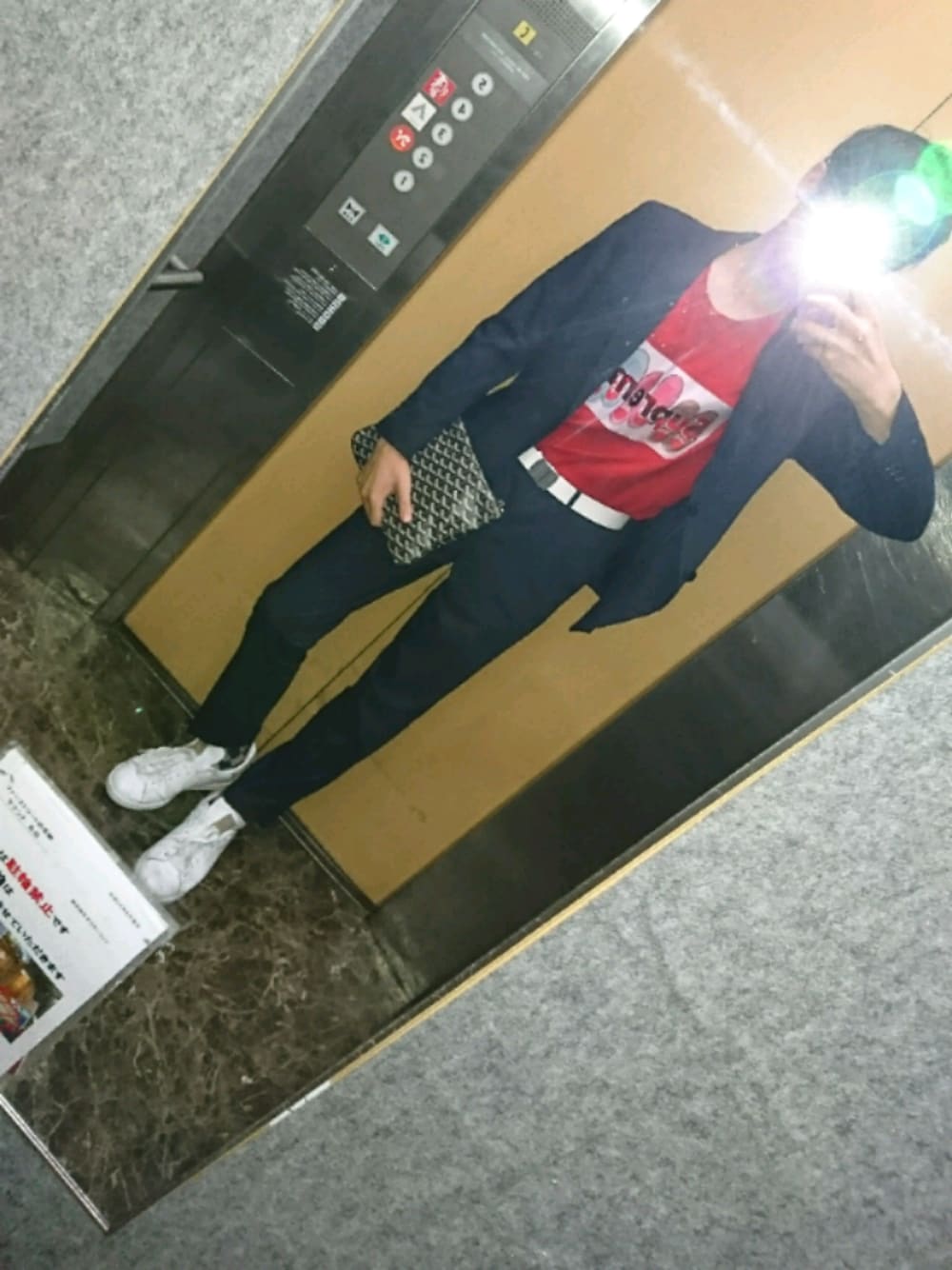 上下で色を合わせてその硬いイメージを赤のTシャツで緩めてさらに白のベルトと、スニーカーで追い込みをかけました。これぞ中和ファッション