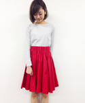 レッド系のスカートを着用したレディースの春コーディネートの1枚目の写真