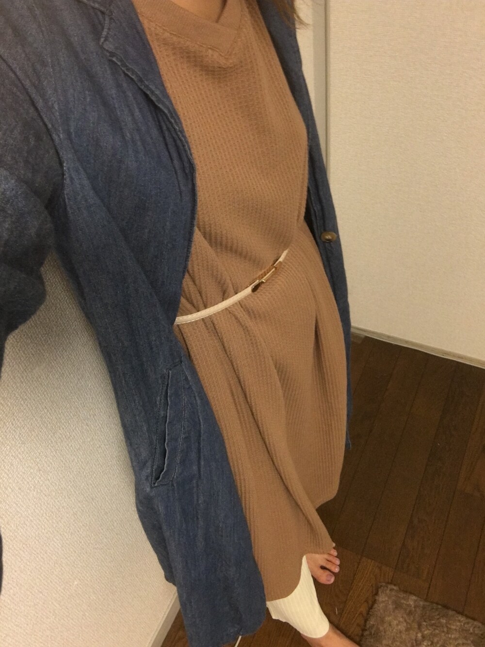 おはようございます〜! 肌寒いのかと思ってデニムのチェスター着たけどいらなかったかな? 今日はワッフルワンピにリブパンツよゆるゆるコーデ♡ ナチュラルカラー好き♡