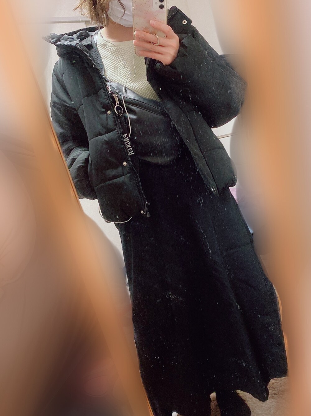おはようございます! 見て頂きありがとうございます♡ 今日は寒いのでダウン返り咲きw パステルとは程遠いモノトーンです。髪切って暗くしたら、さらにカジュアルになりました〜! 最近サス付きスカートにハマってます♡