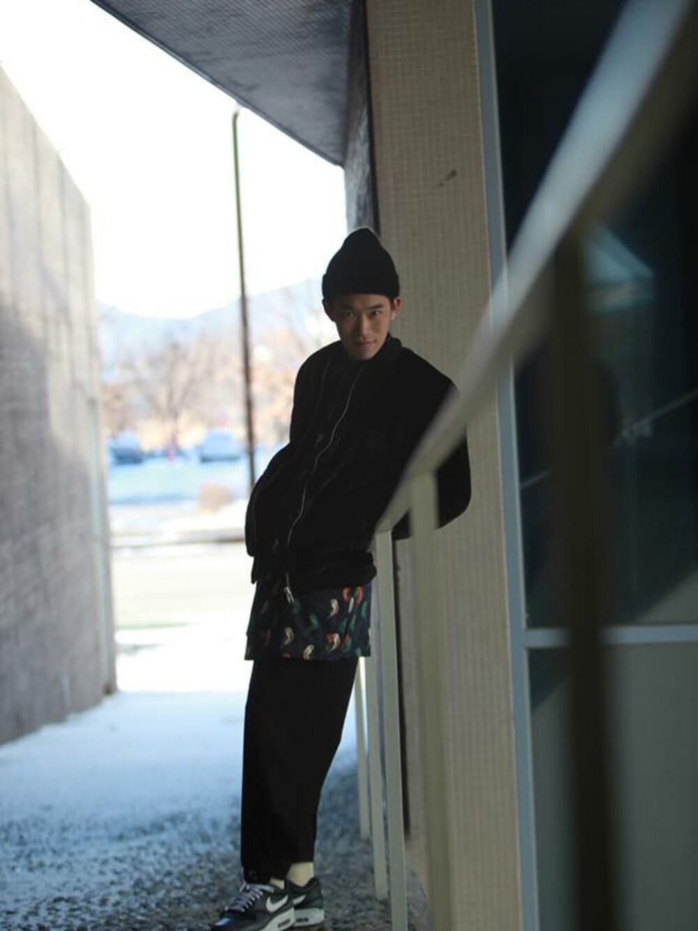 ホワイト系のブルゾンを着用したメンズの冬コーディネートの1枚目の写真