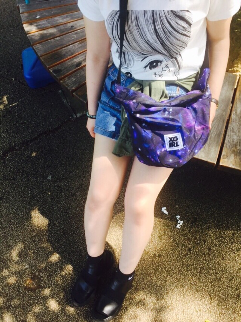 新宿御苑コーデ🐒🌴 うめずTシャツと宇宙柄バックがポイント🌟 エックスガールが主役🎉