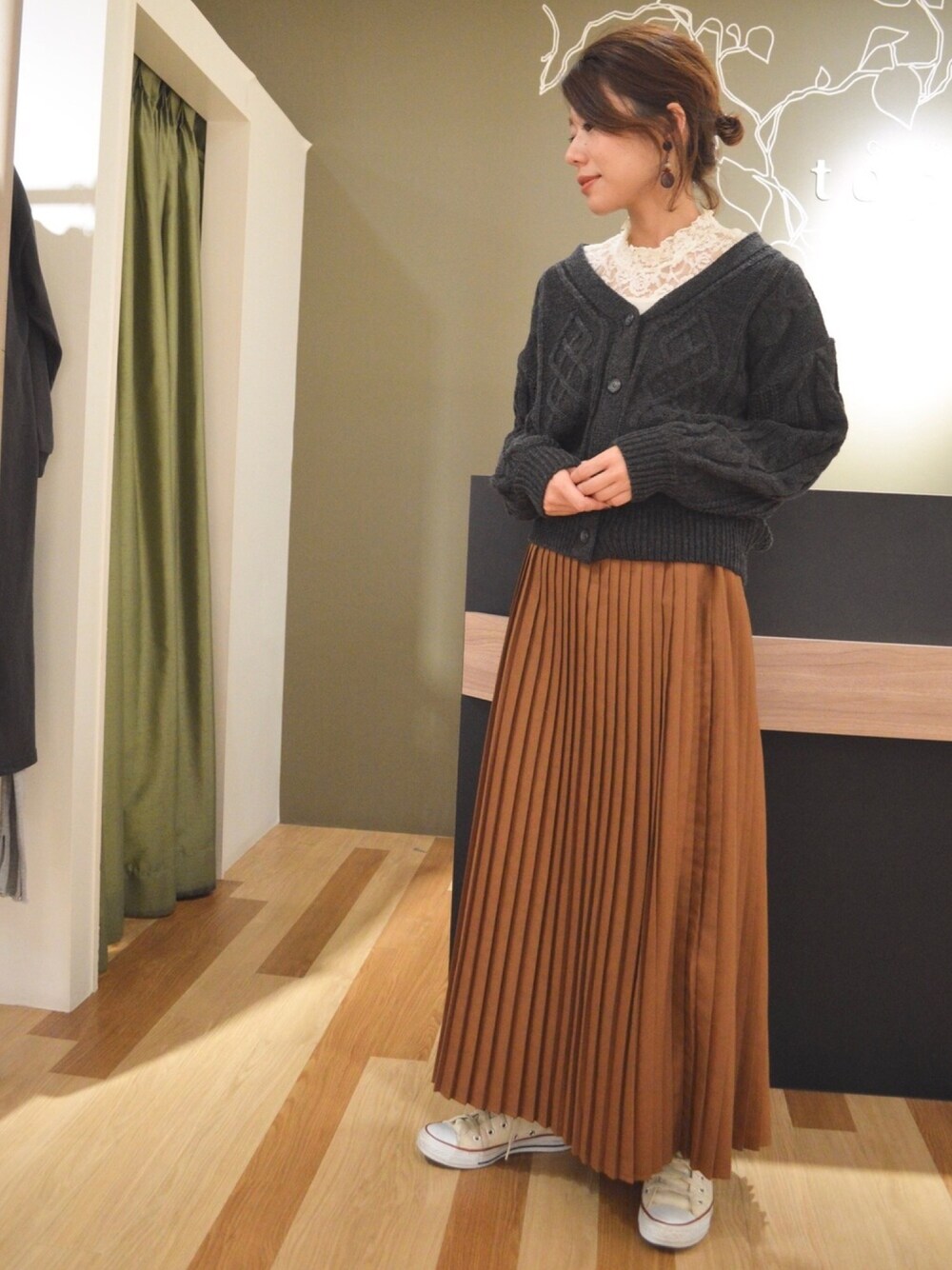 ケーブル編みざっくりカーデの新作が入ってきました♡ お袖は程よいふっくら感 レースハイネックのインナーと好相性です! プリーツスカートは、長さが2種類 私が着用したのは「ミモレ」 もう1種類は「ミディ」 同じお色で好きな長さをお選び頂けます!