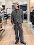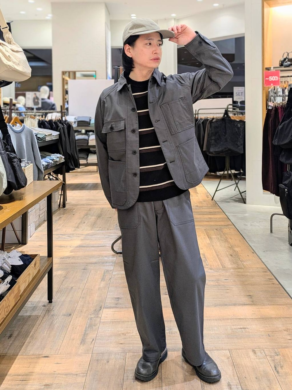 GLOBAL WORK CLEAN MODEシリーズのセットアップコーデ 男らしいタフな印象のグレーデニムのセットアップ。 キャップもグレージュカラーを合わせてインナー以外の色合いを統一しモードでタフなストリートスタイルにまとめています。
