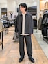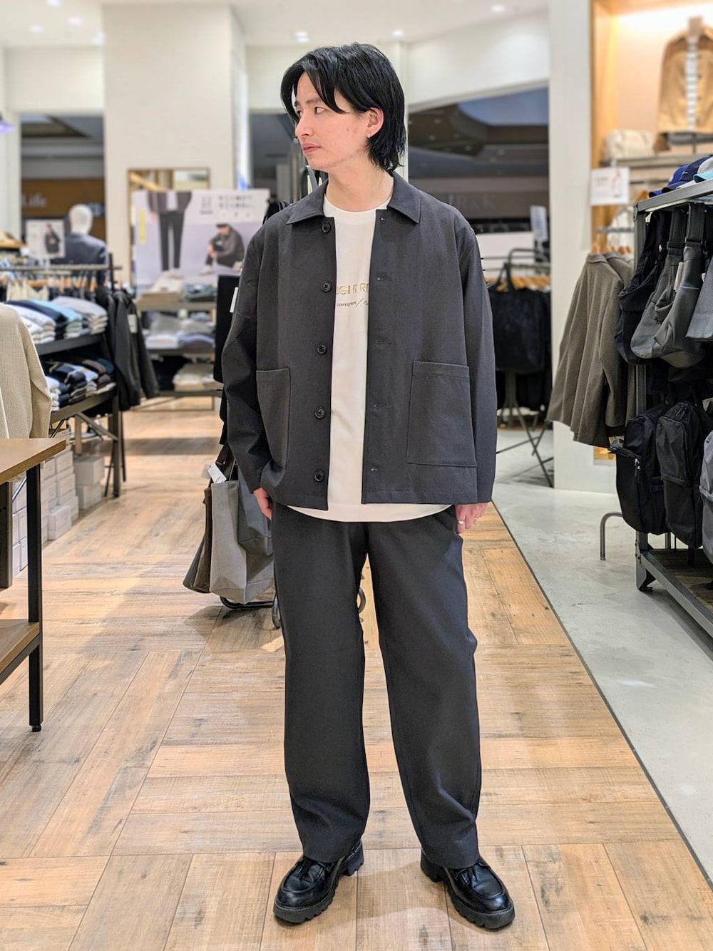 SOLOTEXの素材を使ったカジュアルセットアップコーデ ゆとりのあるシャツジャケットとワイドパンツはセットアップで着ることでよりストリート感のあるカッコイイコーデになります。
