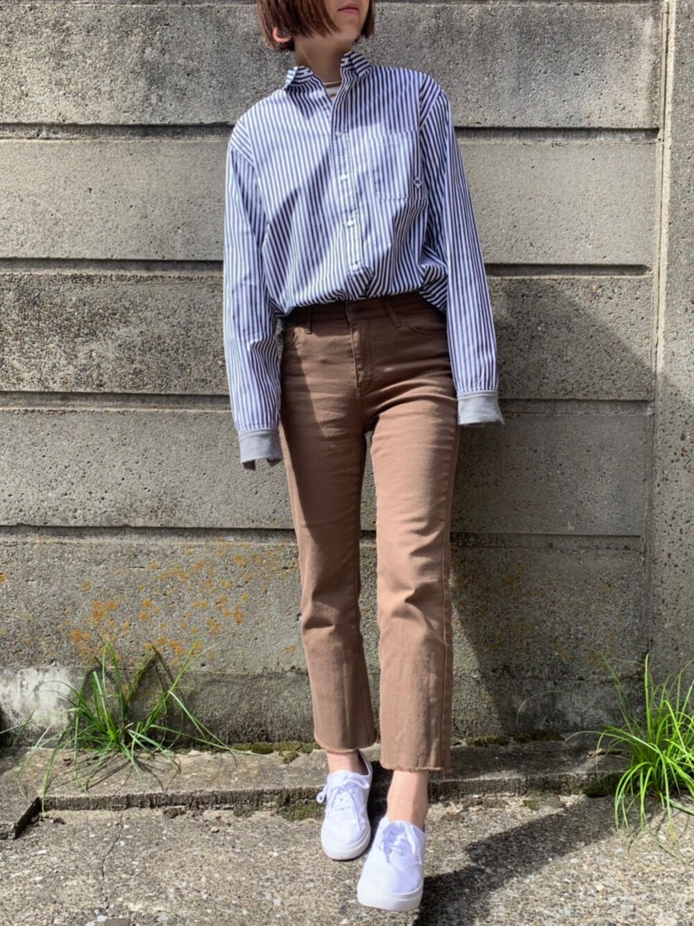 急に寒くなりましたね💦 日中も寒いですが、秋のシャツコーデを楽しみたいので寒さは我慢。 ジムマスターのシンプルなストライプのシャツは涼し気な印象もありますが、ブラウンパンツに合わせて秋の印象に😊🍂🍁🌾🍄