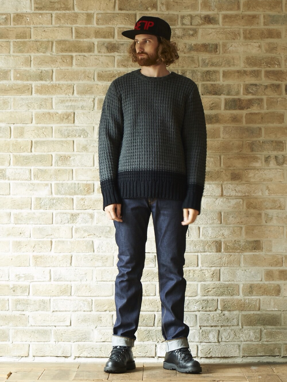 ニット:NOT RIGID・LINKS BONE CREW KNIT パンツ:NOT RIGID・VIRGINIA シューズ:DANNER キャップ:NOT RIGID・HELP