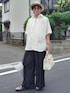 tsuccieのシャツ/ブラウス「オーガニックワッシャーストライプLOGOS刺繍XXL半袖シャツ」を使ったコーディネート