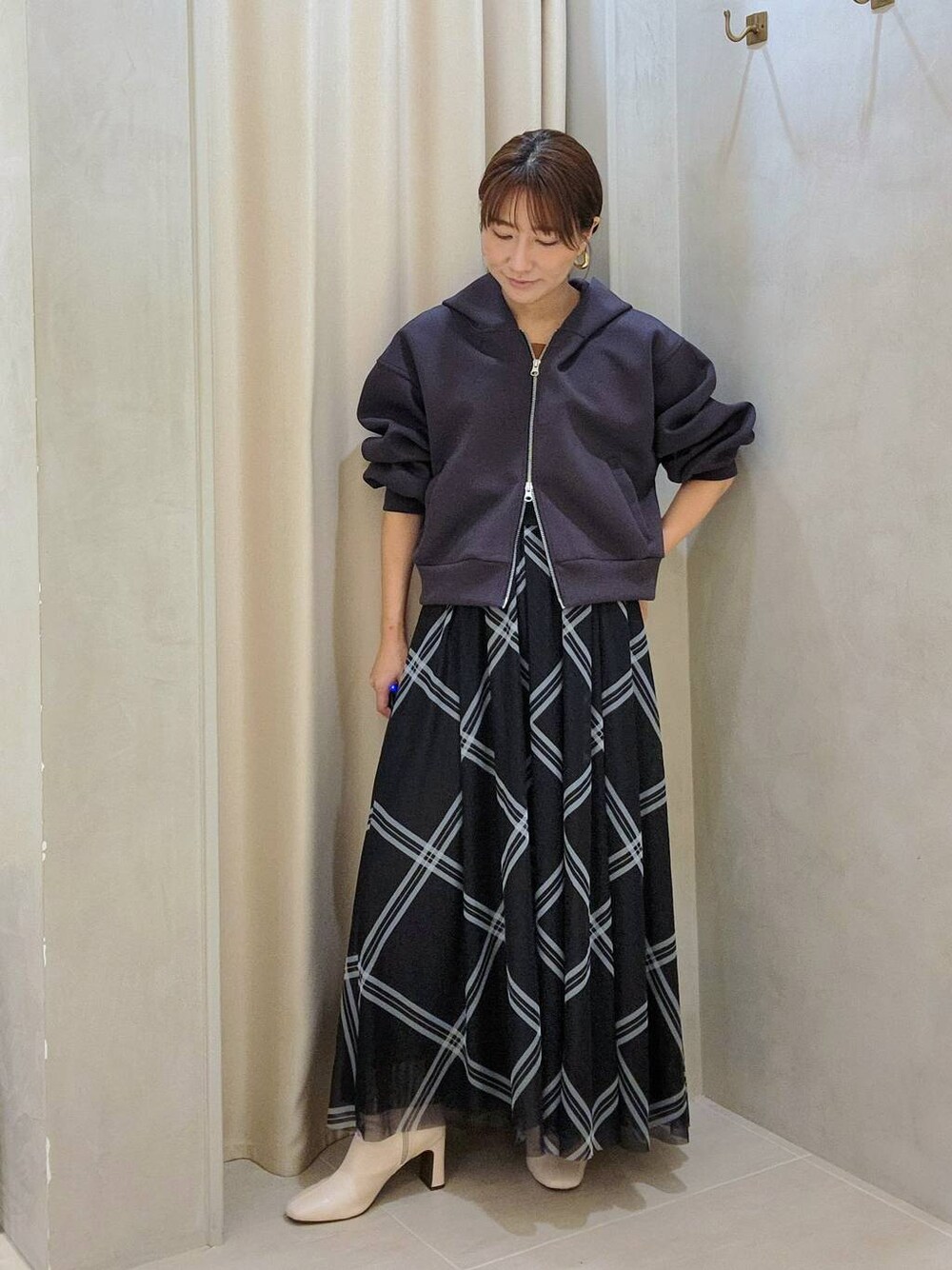 「甘さをおさえた“大人チェック”で、秋のロング丈もすっきりと」 👗着こなしポイント ボリュームのある柄スカートは、コンパクトなショートブルゾンでバランスを調整。 上半身をコンパクトにまとめることで、小柄さんでもロング丈が重く見えません。 首元を少し抜いて着ると、抜け感が出てぐっと大人っぽい印象に。 足元は白ブーツで軽さをプラスして、秋のダークトーンを明るく見せています✨ 小柄さんにおすすめ丈のトップスです!