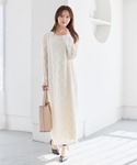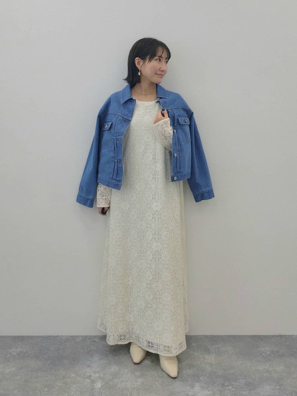 アウター、ワンピース共にフリー。 小柄さんはベルトでブラウジングしていただけるときれいに着ていただけます! ・Iラインのレースワンピースで縦をしっかり強調 ・短め丈のデニムジャケットが重心を上に引き上げる ・淡色×淡色でも、素材のコントラストでぼやけない