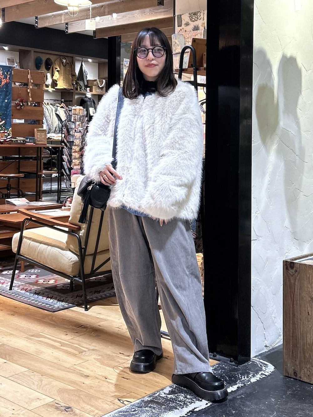 アウターなしの写真もあります🤳 ご覧いただきありがとうございます(*´꒳`*) 【アウター】 毛足長めのファーが高見えするアウター ノーカラーで首周りスッキリ! 一気にフェミニンな雰囲気になるおすすめアウター! 【インナー】 抜群の伸縮性で程よく肌にフィットします 首元と袖口のメローフリルがニットやスウェットからちらっと見えるのがかわいい 全色欲しくなるこの時期の万能インナーです! 【ニット】 ケーブル編みがかわいいニット さりげないフリンジデザインが一枚でバッチリ決まる👌 スキッパーデザインで重くなりがちなニットもスッキリ見える! 【パンツ】 樽のような丸みのある流行りのバレルパンツ お尻周りや太もも周りがゆったりしているので体型カバーにぴったり! 独特な凹凸のある生地です! 気になるアイテムは下の『使用アイテム』からチェック👀 ぜひ店頭でも、お気軽にお声掛けください! イオンモール新小松でお待ちしております🍒
