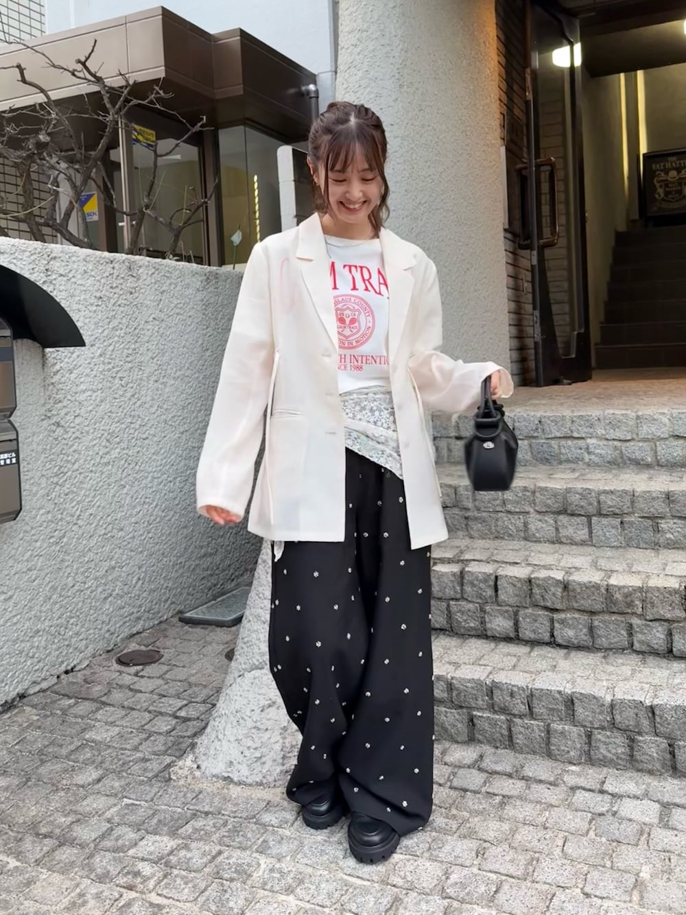 フラワービジューがポイントになって可愛いスラックス! ウエストがゴムと紐仕様なので、楽な履き心地です! シアージャケットを合わせてキレイめな印象にしました。 Instagram⇨@____3io._ コーディネート投稿してます!よかったら見てみてください! 参考にして頂けたら嬉しいです☆