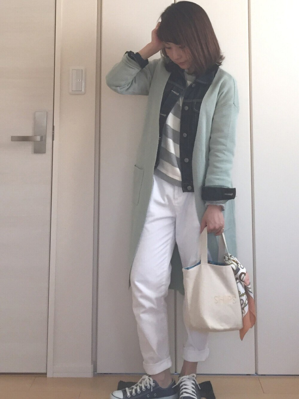 私服show♩ 今日はGジャンにボーダー、白デニムに この間買ったばかりのロングカーディガンを レイヤードしてみました😘💓 このguのカーディガン、前から狙ってたんだけど 色が黒しか残ってなくて諦めてたら、 再入荷&値下げしてて即決😍💓 1900円で買えましたー❤️ 春っぽいグリーンがお気に入りです❣️ そして、何人かのフォロワーさんが ホワイトパンツ祭りに参加していたので 私も参加させていただきました❤️ お洒落な方々の中に入るのは恐縮ですが、 主催者様始め、参加者のみなさん よろしくお願いします🐱❣️ あと、普段暇つぶしにMERYを見るのが日課 なのですが、なんと❣️私の投稿がピックアップ されていましたーーーー😂😂😂✨✨ すごくびっくりした❣️ MARC BY MARC JACOBSのバック特集と キャメルバックの特集2つに掲載させて いただいてます😳💓 初めてのことなのでびっくりですが とってもhappyでした❤️ MERYさん、ありがとうございます😘💓 長くなりましたが…(笑) いつも❤️、セーブ、コメントありがとうございます🎶 また遊びに行かせてもらいます🙈💓 ではでは😎✨