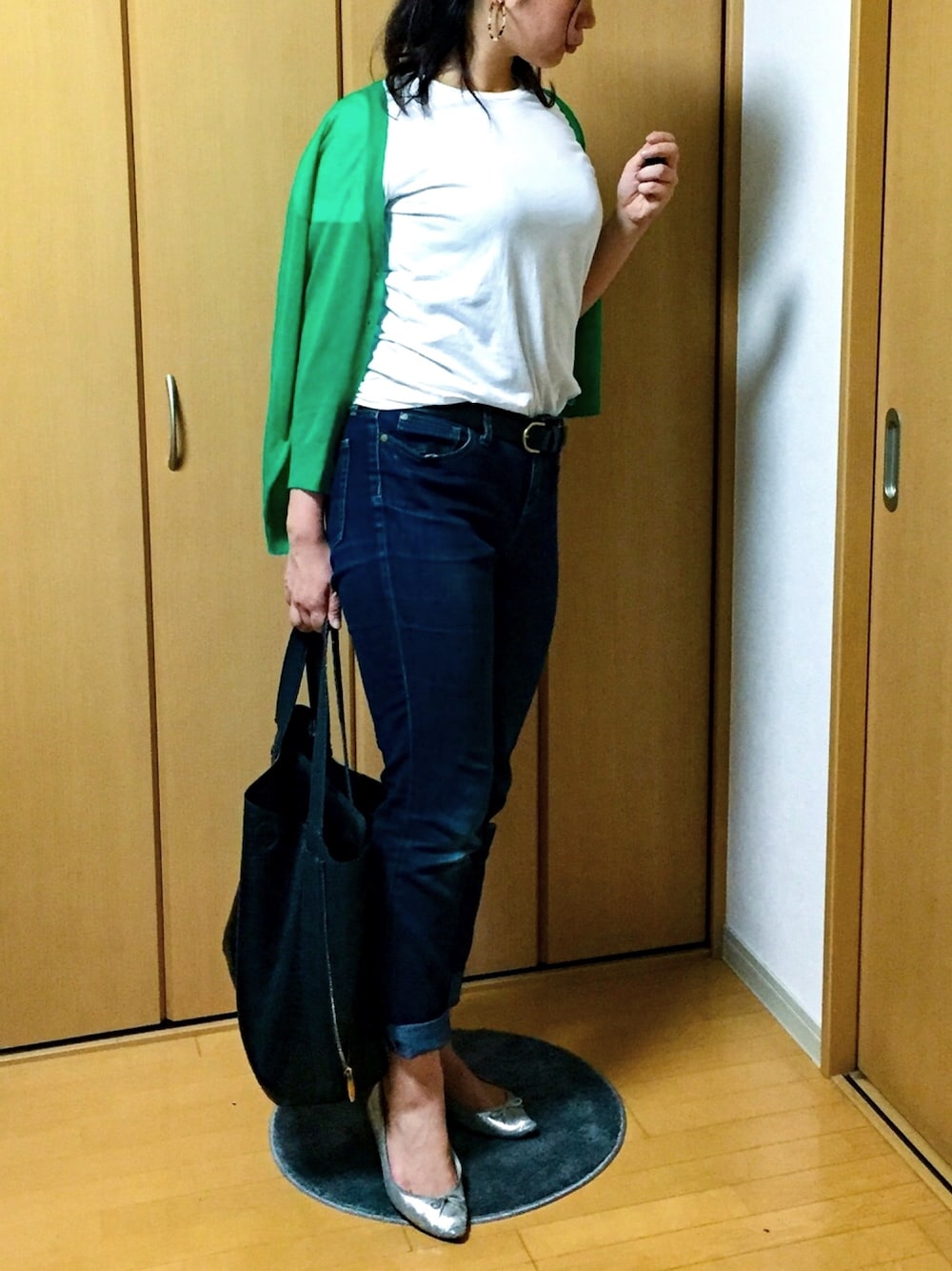 お休みコーデ。 PCもって、旦那さんと近所のカフェへ。 その後もブラブラしてまったり過ごしました。 dholicのカーディガンは ハッキリした緑のカーディガンが欲しくて いっぱい探してようやく見つけたもの。 ベースアイテムにプラスして重宝してます。
