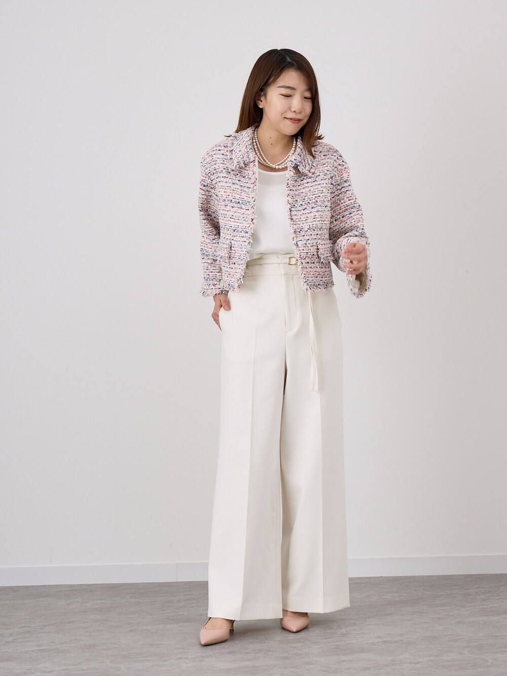 デイリーにもお勧めのツイードジャケットのご紹介。 フリンジを施した襟はステンカラーで仕上げた少し珍しいデザイン。 ゆとりのあるサイズ感なのでストレスフリーな着心地でカーディガン感覚で着用いただけます。 着丈は短めなのでワンピースの羽織にもバランスよく着用いただけます。 抜け感のあるカジュアルスタイルにツイードを取り入れたい方にお勧めの1枚です。