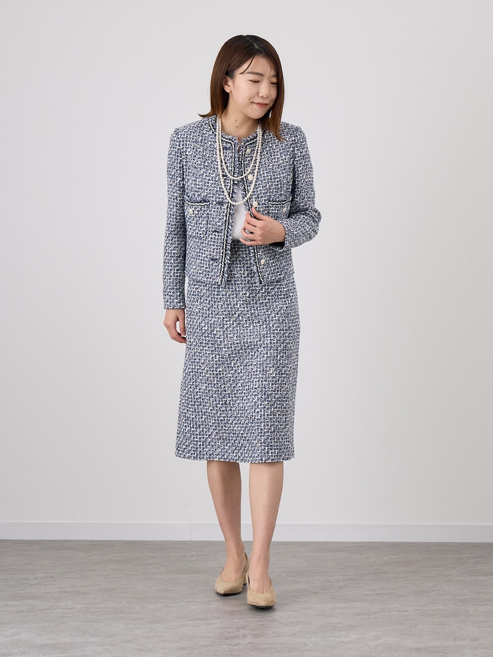 トゥルニエ社のこだわり抜かれたツイードセットアップ。 ネイビーですが、明るめの配色で織り込まれているので重くなく、爽やかに着用いただけます。 今回はインナーを白にしましたが濃いめのネイビーなとで締めても素敵。