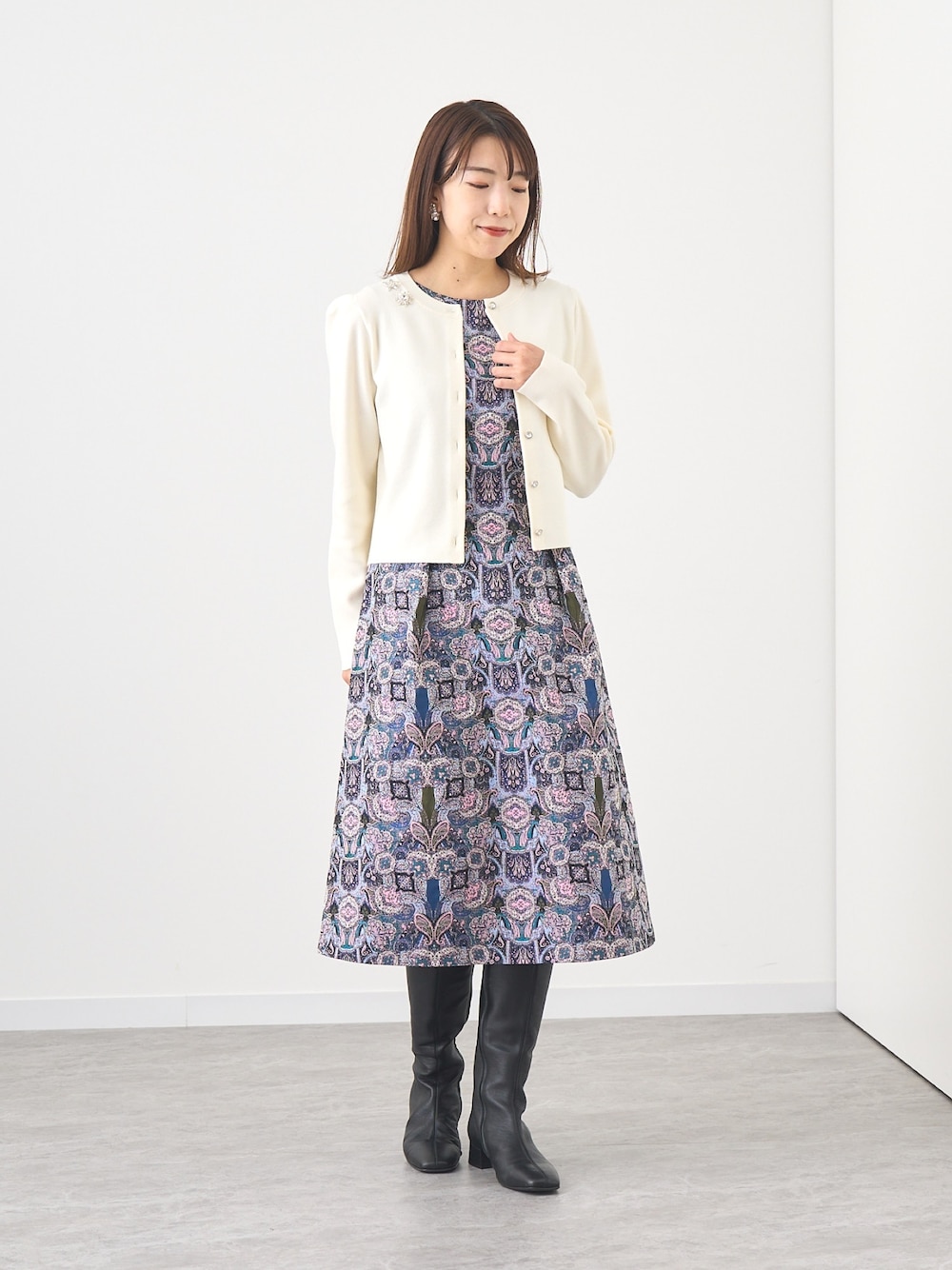 ・タロットモチーフタック ワンピース イタリア、LIMONTA(リモンタ)社のANAYI別注ジャガード生地を使用したワンピース。 程よくハリのある素材がシルエットをきれいに見せてくれます。 ハイウエスト切り替えでウエストに小さくタックを入れたデザイン。 広がりすぎないフレアシルエットで縦にすっきりをした印象です。 ・メリノウールビジュー カーディガン ビジューブローチの取り外しが可能なカーディガン。 上質なウール素材で肌当たりが柔らかく素肌にもご着用いただけます。 袖山にタックのデザインとビジューが女性らしいアイテム。 着丈は少し短めなのでワンピース合わせやハイウエストのボトムス合わせがおすすめです。