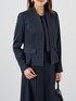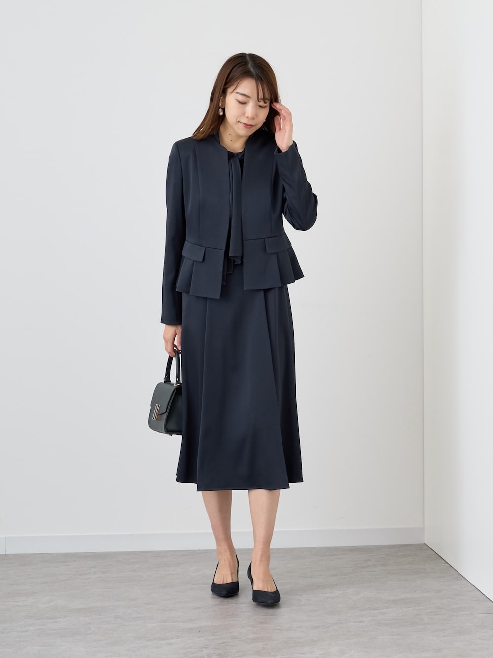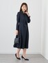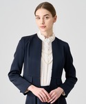【Eternal Line 2024】 セレモニー、オケージョン、お仕事使いにお勧めのスタイリング。 固くなりがちなネイビーのセットアップも上品な光沢のあるサテンで華やかさをプラス。 ペプラムシルエットとフィットアンドフレアのワンピースはフェミニンな印象です。 ジャケット、ワンピース共に絞りのあるデザインですが、柔らかい生地感なので気苦しさもなく着用いただけます。 また、ワンピースの襟もとのタイは内側ボタンで着脱可能。 外すとシンプルなクルーネックになるため、シーン合わせてイメージを変えて楽しんでいただけます。
