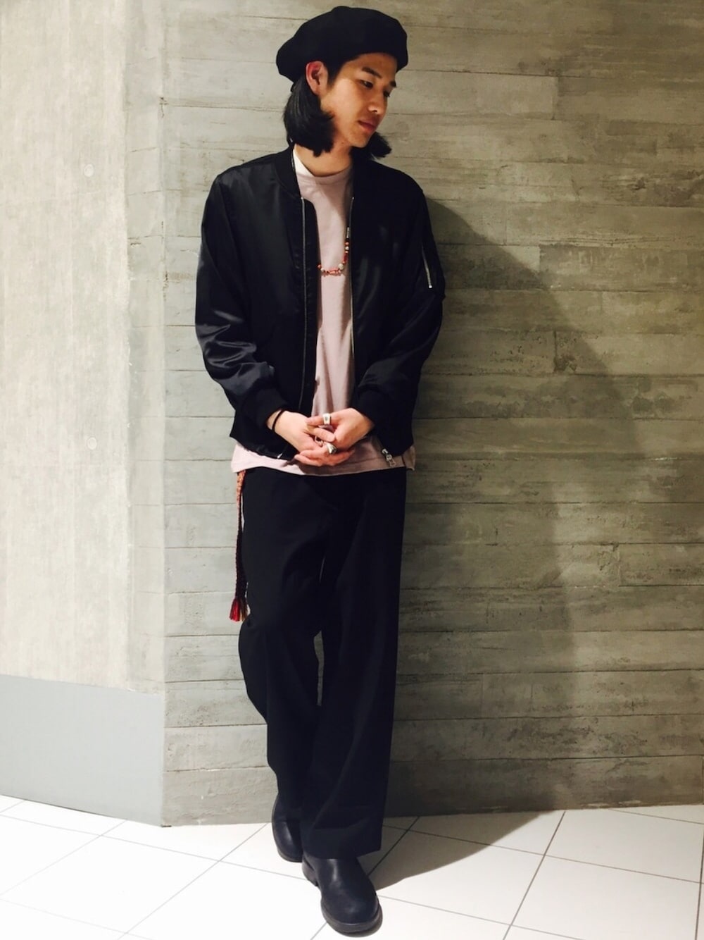 こんばんは。 本日はサテン生地のMA1にワイドパンツを合わせたスタイリング。 インナーでピンクを使用していますが、今年はちょっと注目の色です。 明るい色が苦手な方も、インナーから挑戦してみるのもいいかもしれません。 よろしければぜひ。 KOBAYASHI