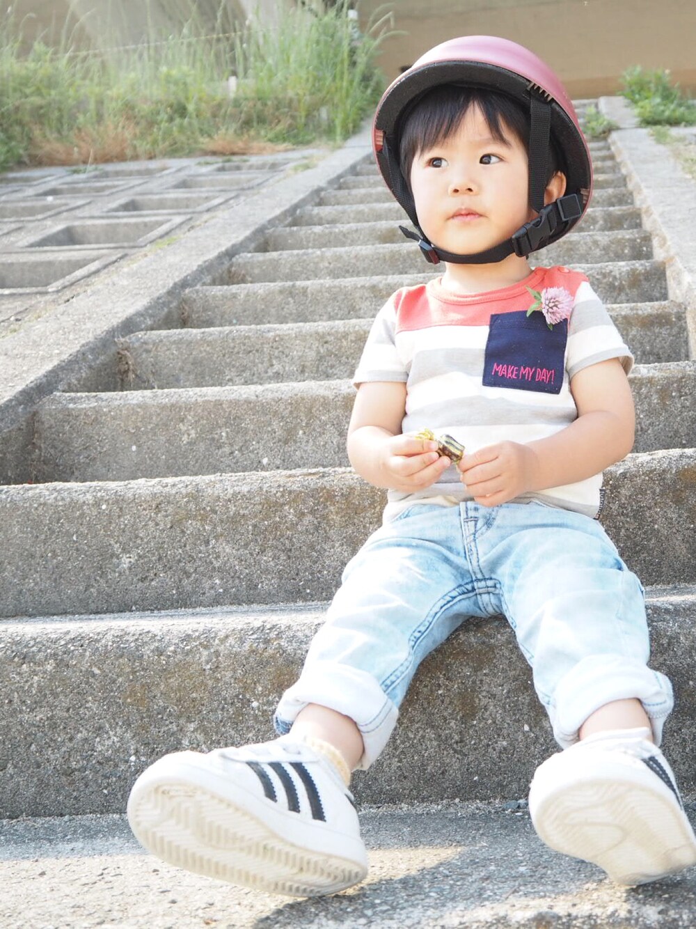 オレンジ系のTシャツ/カットソー、ブルー系のデニムパンツを着用したキッズの春コーディネートの1枚目の写真