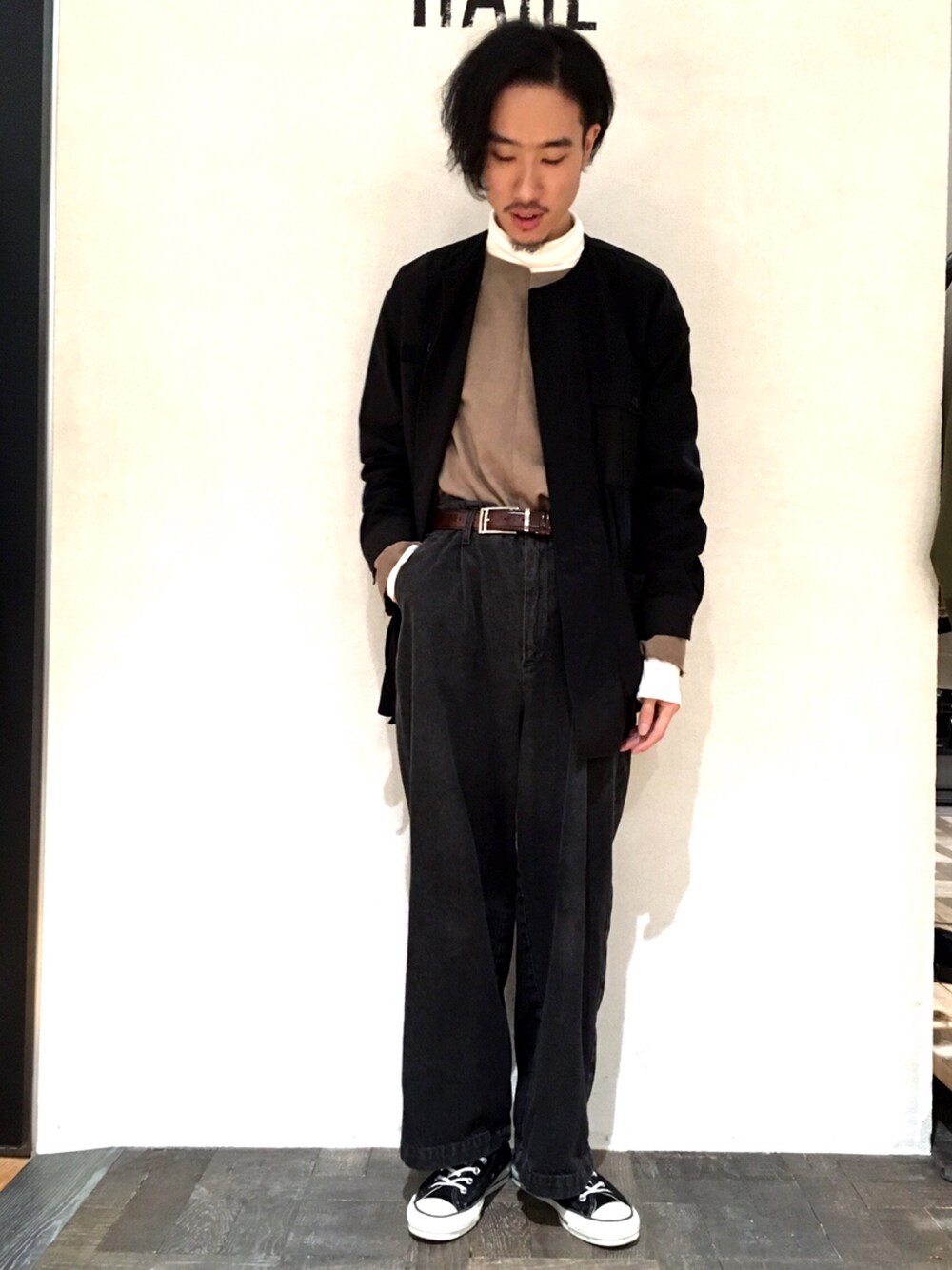 こんにちは、HAREなんばマルイ店の青木です! いつもご覧頂きありがとうございます^ ^ 沢山のいいね、SAVE、フォローもありがとうございます^ - ^! コメントもお気軽にお待ちしているので何か気になること、なんでも良いのでお待ちしております^o^ 明日は天王寺ミオ店出勤です! 本日のテーマ、ギュンギュンにタックイン。 本日は個人的に好きなアイテムで固めてみました^ ^ 着方や見せ方は変えて着ていて雰囲気を出せるように意識しました。 もう涼しくなってきたのでタートルを使用して クリーンな印象になるようにしています。 シャツはノーカラー仕様なのでタートルとの相性も良いです^ ^ そこにトレンド要素のFスウェードのプルオーバーを挟んでカラー、素材で遊んでいます。 ポイントは タックインの位置です。 通常ハイウェスト(腰上)で履きますが 今回はへそのポジションで履いており より脚のラインがキレイに見えることと 上品に見えるように意識をしています^ ^ 髪もデコ出しでシンプルにまとめて アイテム、着方のバランスに合わせています( ̄^ ̄)ゞ