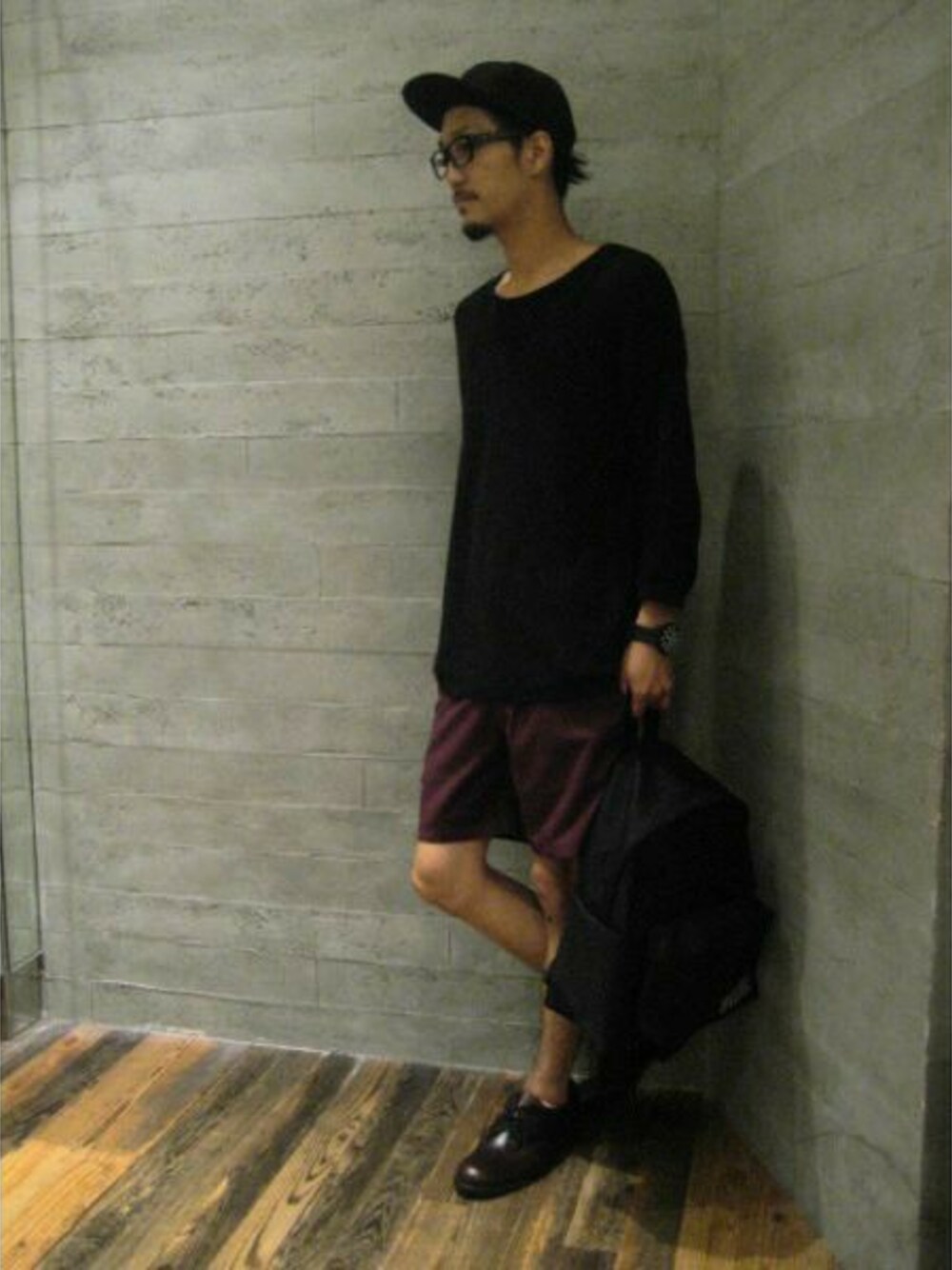 コンパクトなショーツにざっくりとニットを合わせたコーディネート。アクセントにボルドーカラーをON。