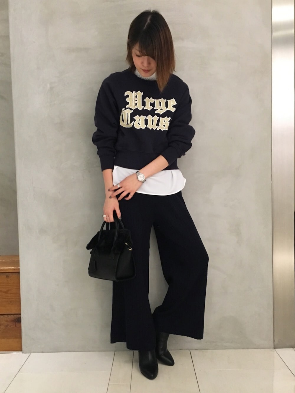 前回も履いていたニットパンツの着回しコーディネートです! ブラウスをレイヤードすればカジュアルなスウェットで合わせても👌🏻 このスウェットもプリントやエリの古着っぽい加工が可愛いくてオススメです👶🏻💕