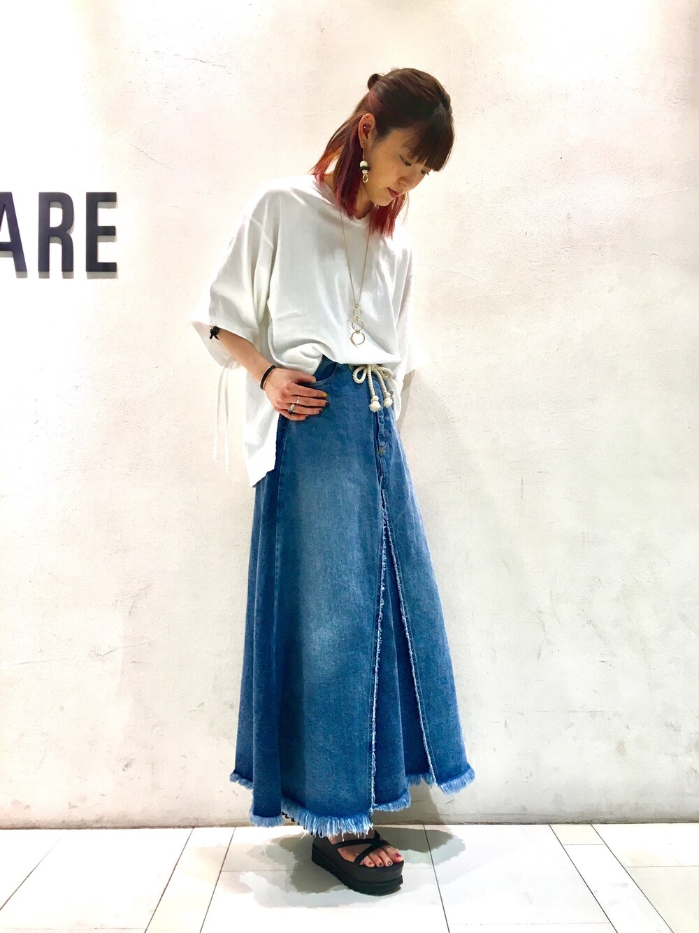 今年の夏はリメイクデニムがアツいです☀️☀️☀️ HAREのデニムスカートはパーツによって濃淡の差があるので、ボリューミーながらも美シルエット。 ウエストのアイレットがいいアクセントになっています! シンプルにカットソーを合わせてウエストでギュッと絞って履くのがオススメです👌💕