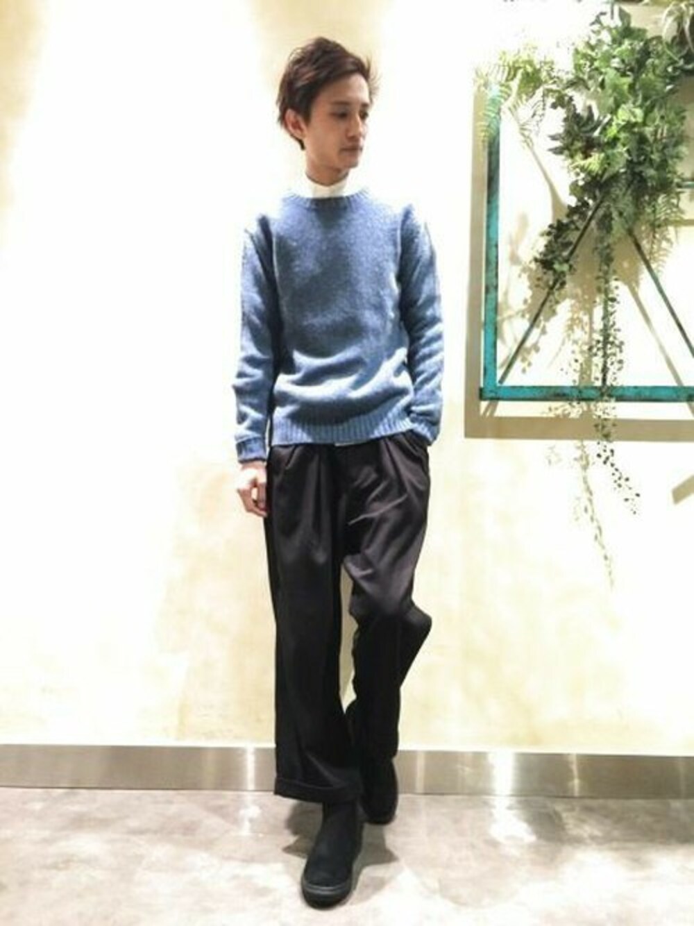 綺麗なブルーのニットはこの時期から春先までしっかり使えるアクセントの効いたアイテムです! ワイドパンツで崩したスタイリングがトレンド感を出します!