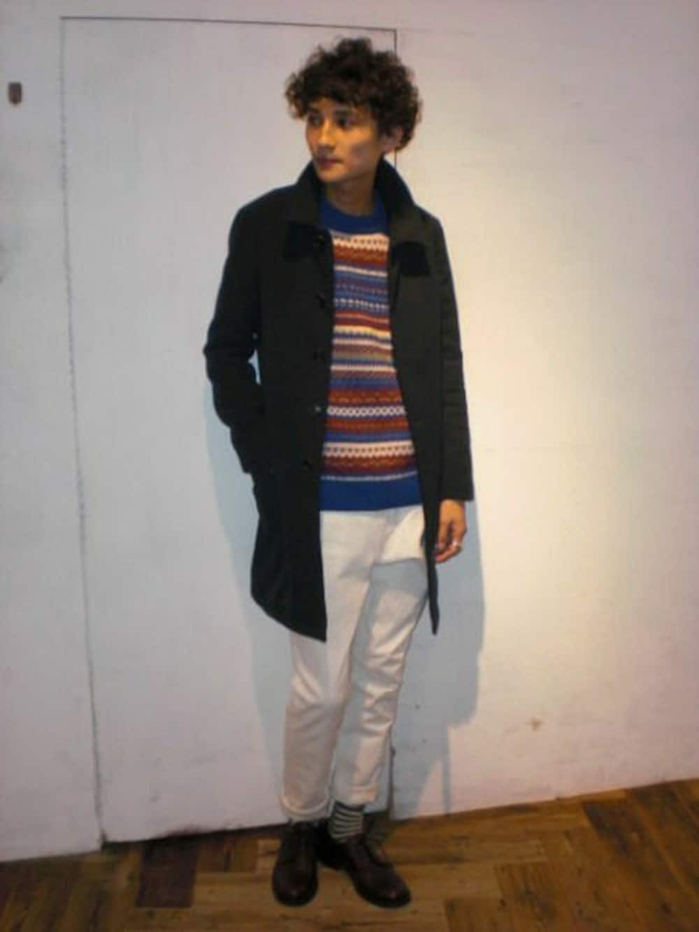 インに着たブルーのニットがアクセント。コートをシャープなスタイルでまとめました。