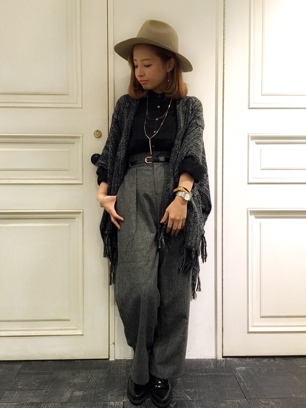 今期注目のポンチョを使ったコーディネートです! アクセサリー以外をダークトーンでまとめました^ ^