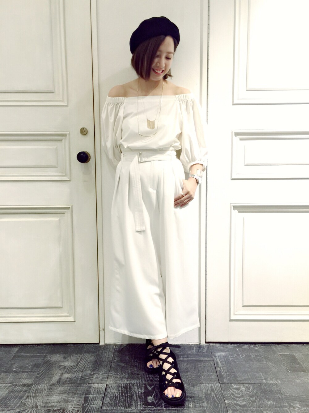 夏のオールホワイトコーデ☀️ 人気のオフショルダーブラウスが再入荷しました! ブラウスとワイドパンツは白で固め、小物を黒でまとめて甘くならないようにしました(^^)