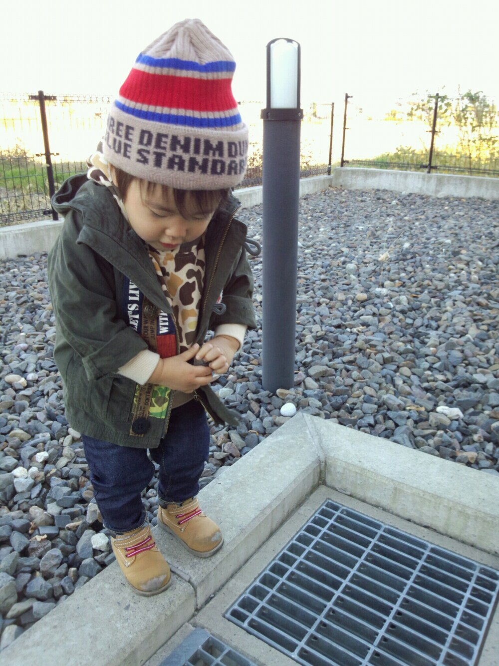 いつかの僕♬ DDのライン入りロゴニットキャップがお気に入り( ´艸`)♡ ジャンクストアーのモッズコートとの相性もバッチリ(*^^)v 変な歩き方にハマって、西松屋のブーツのつま先がボロボロ(x_x)