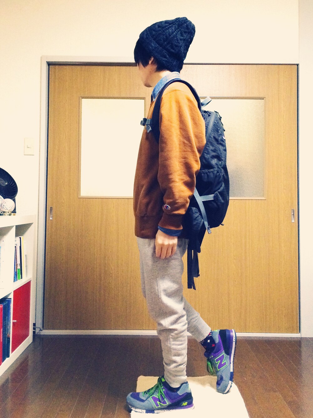 シャツ:FIVE BROTHER 靴下:American Eagle 上下ともチャンピオンで合わせてみました。 茶色のスウェットは可愛くてお気に入りです。