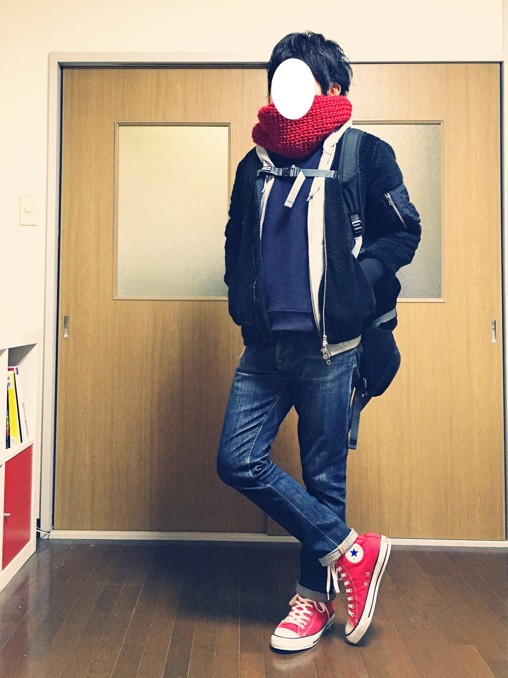 今日も差し色は赤で。 スヌード暖かいです。