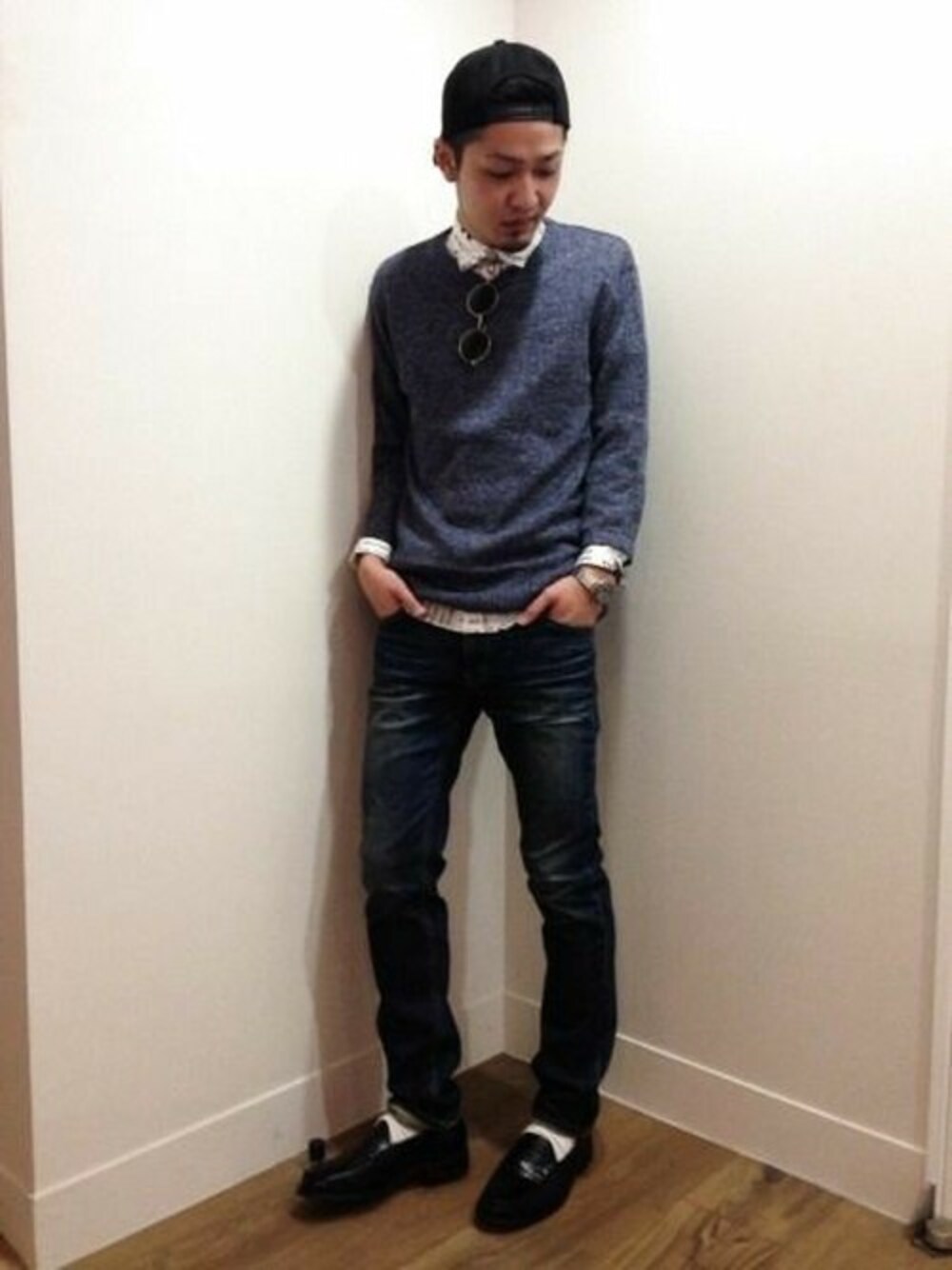 トップスとパンツはブルーで統一感を出し、インナーンに柄シャツを入れてラウンドフレームサングラスなどの小物を使用した遊び心のあるスタイリングです。