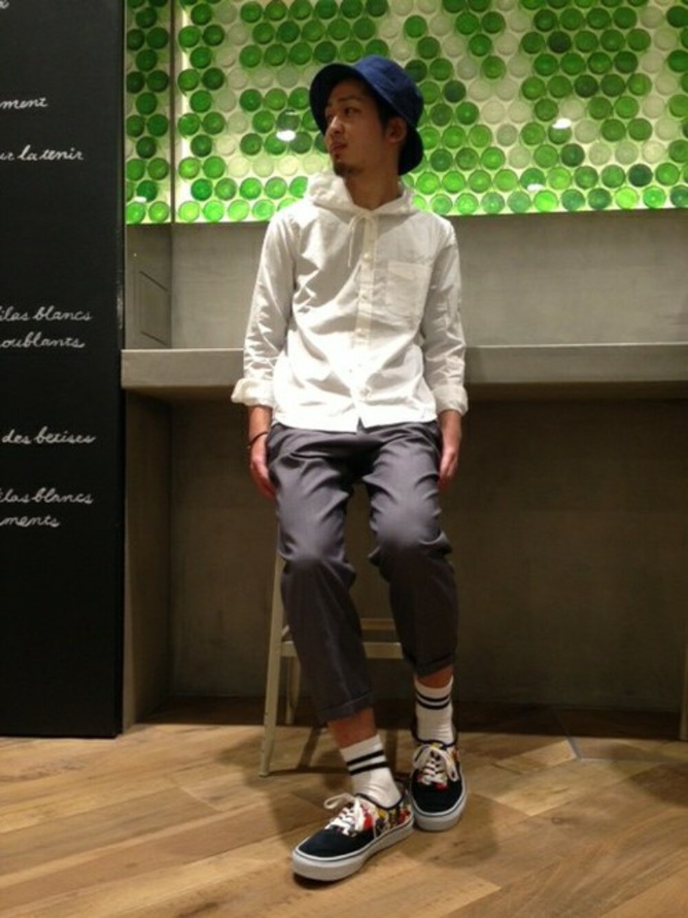 スポーツテイストとキレイ目なテイストをMIXさせたスタイリング! 足元にはHARE×VANSの別注スニーカーで遊び心を演出しました。