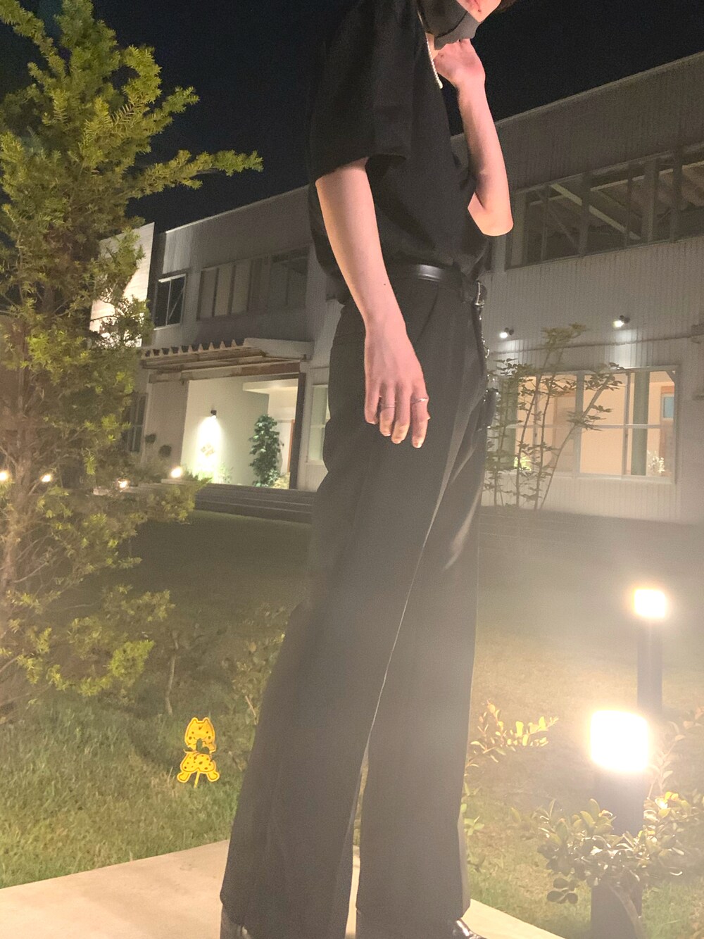 全身真っ黒コーデです 真っ黒で重いのでパールネックレスとキーホルダーを付けておもすぎづ真っ黒でもかっこよく決まります! 暑すぎる日はもしかしたらお勧めできないのかな笑笑