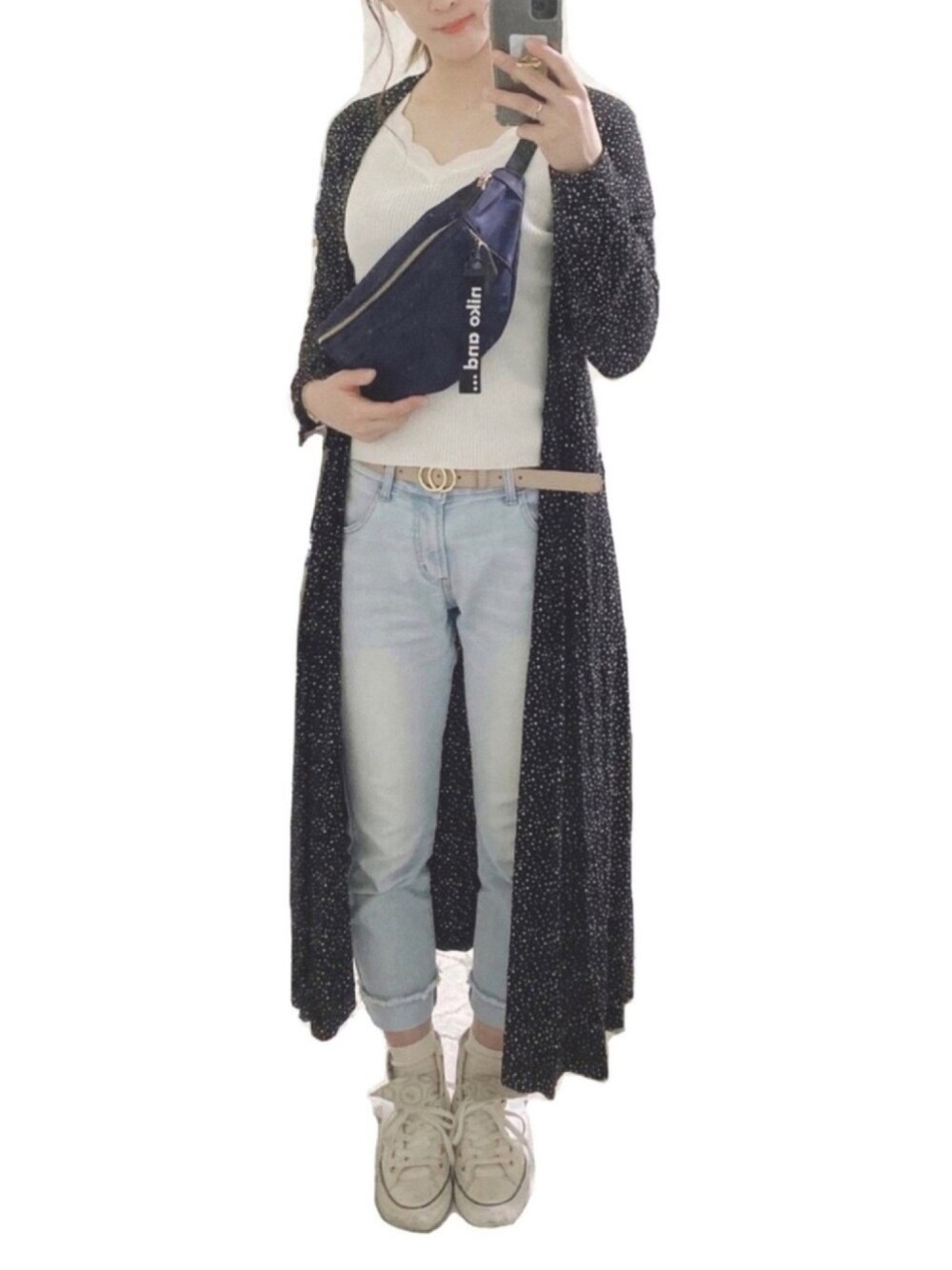 中はロペピクニックのトップスと earthのジーンズで淡い色にして 外はUNIQLOのワンピースを 羽織りとして着て黒で締めてみました☺️☆彡 このワンピ、細かい星柄が 散りばめられてるのが可愛くて 気に入ってます🥰♪