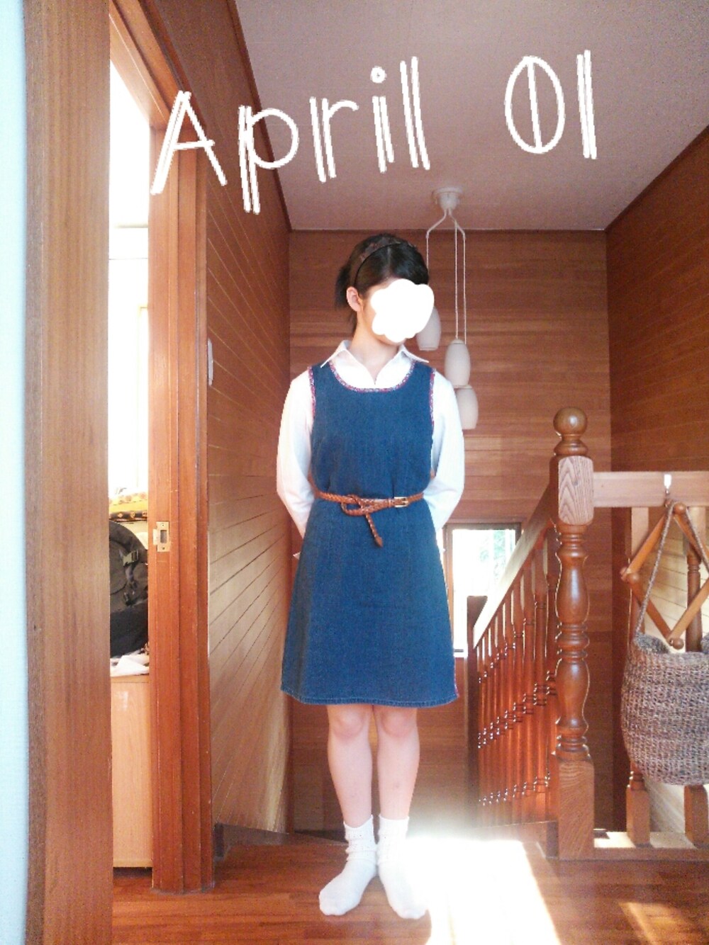 母おさがりのデニムワンピに白シャツ♪ シャツは、袖の長さが合わなくなって使わなくなった就活用のものを再利用(?)実は袖をまくって腕を出してます(^^ )